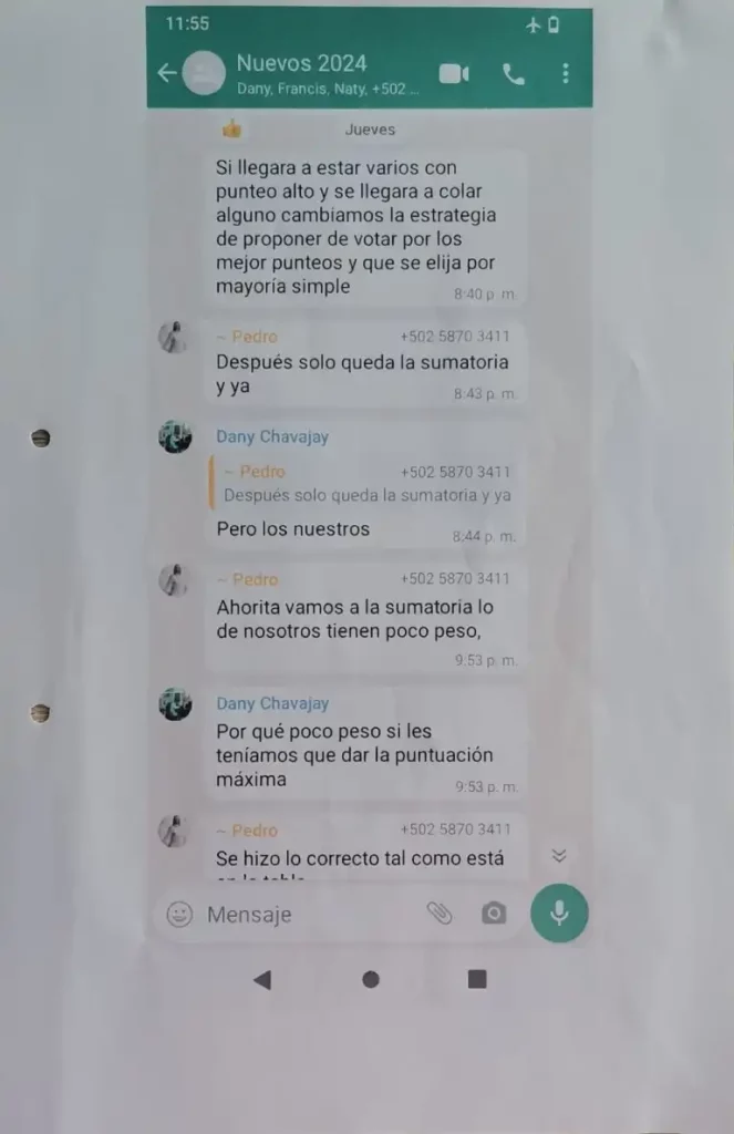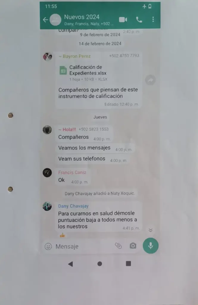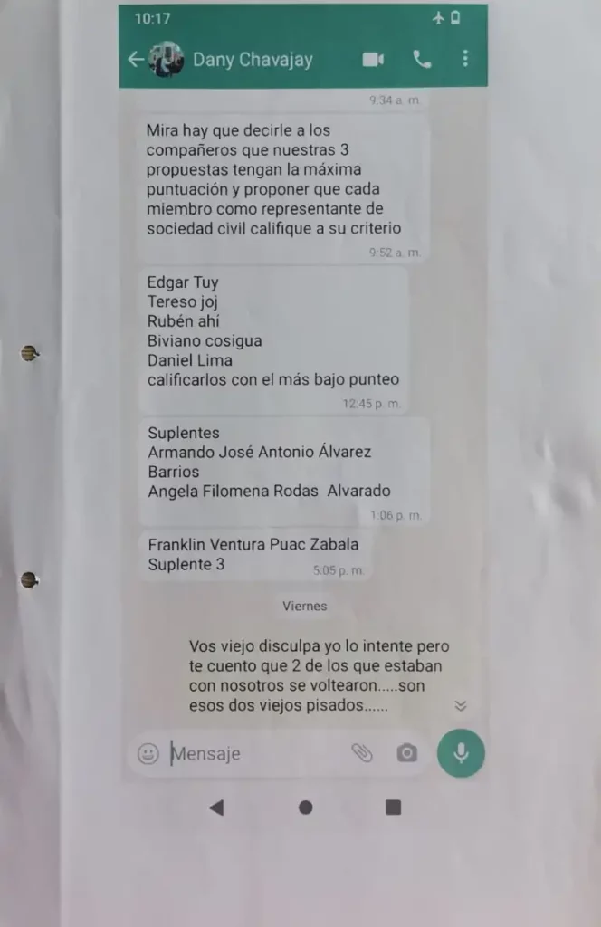Entre las conversaciones que escribieron durante los días en que estaba el proceso de elección de la terna, Chavjay pide al grupo: “para curarnos en salud démosle puntuación baja a todos, menos a los nuestros”, a lo cual uno de los representantes responde: “Así lo estamos haciendo”.